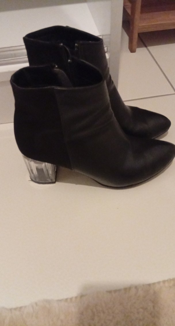 Siyah deri kadın botları, blok topuklu ve tokalı detaylı, desen içermeyen şık tasarım, ofis kullanımı için uygundur.