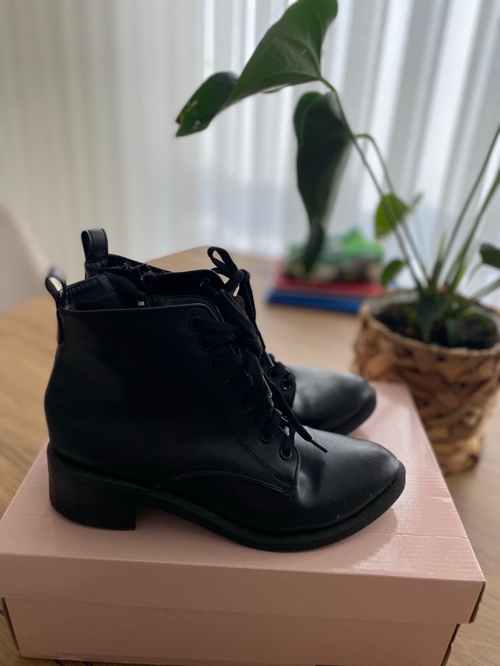 Minimalist goth tarzında, tokalı ve blok topuklu siyah deri kadın botları, günlük kullanıma uygun. Hiç kullanılmadı nerdeyse