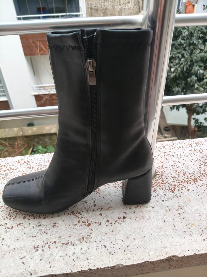 Siyah deri, blok topuklu, yan fermuarlı kadın botu. Günlük kullanım için uygun.