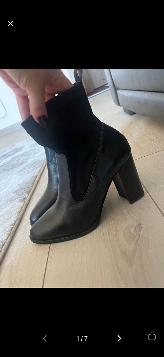 Ofis kullanımı için uygun, tok topuklu, tokalı siyah deri kadın botları. Desensiz, gotik ve trend günlük stil bir arada. Elle çorap bot bir kere tek kullanıldı