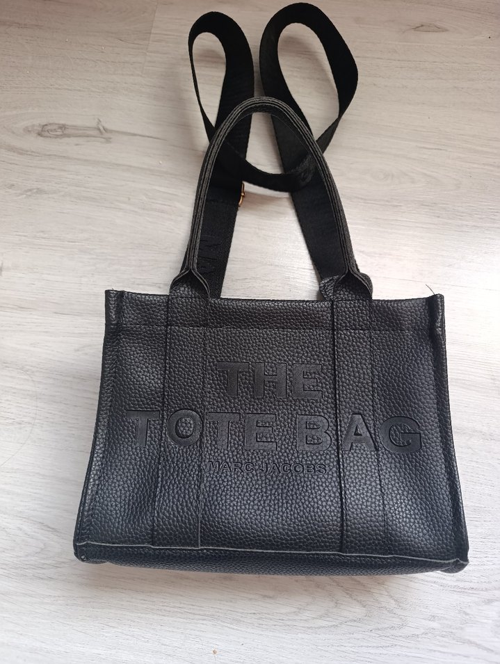 Siyah deri tote çanta, tokalı ve baskılı detaylara sahip, Paris tarzı sokak modasına uygun trend günlük kullanım için.
