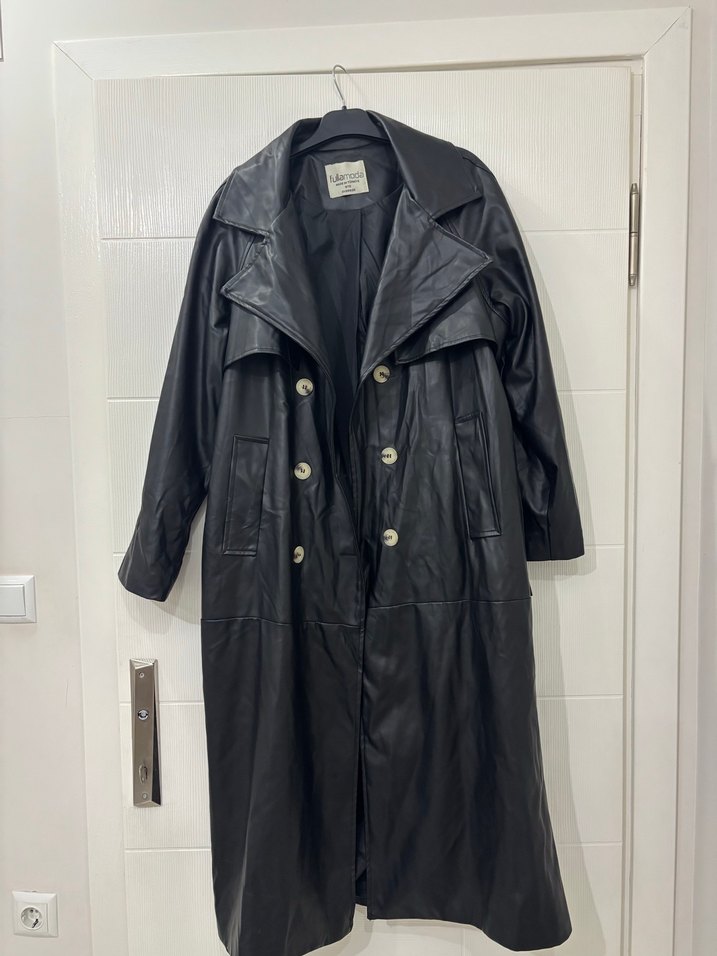 Siyah deri, uzun kesim kadın trençkot, çıtçıtlı önü ve yakalı tasarımıyla dikkat çeker. Strappy kollu, regular fit, ofis ve sokak modasına uygundur.