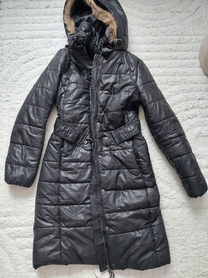 Siyah deri, uzun kesim, kürklü kapüşonlu, oturan kesim kışlık kadın mont. Notlu yaka ve askılı kollara sahip, şık sokak tarzına uygun. bir fermuar yerinde sıkıntı var sadece.