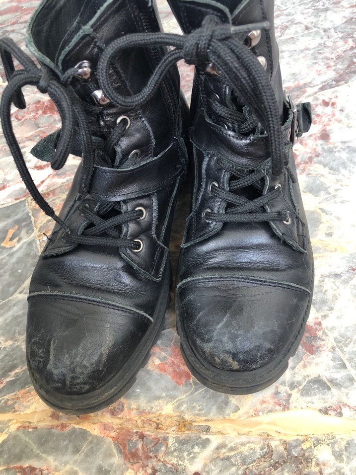 Siyah deri, yüksek topuklu, tokalı ve bağcıklı kadın botu. Grunge punk goth tarzıyla günlük kullanıma uygun. Gerçek deridir 35 numara boyanırsa yeni gibi durur.