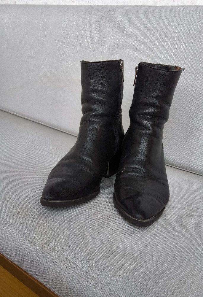 Siyah deri ve blok topuklu kadn botları, minimalist ve gotik tarzda, günlük kullanım için uygundur. Fermuar içinde sökük var.