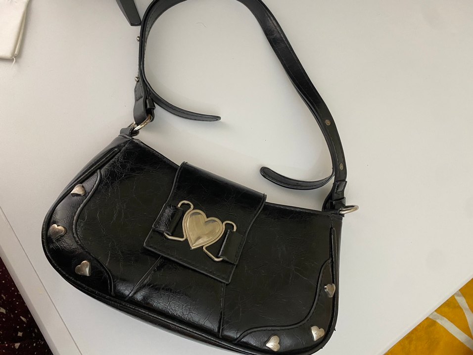 Parlak siyah deri kadın çanta, tokalı kalp detayıyla şık ve spor tarzda, 2-3 kez kullanıldı