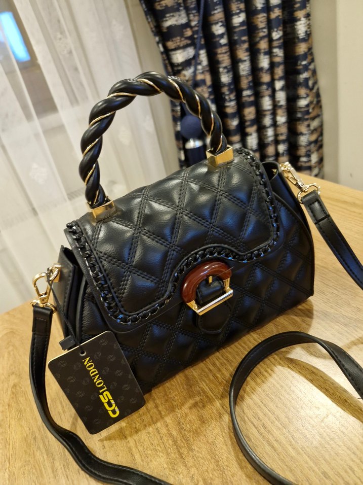 Kapitone dokuya sahip siyah deri çanta, burgu saplı ve tokalı kapaklı, uzun askısıyla çok yönlü kullanım sağlar.