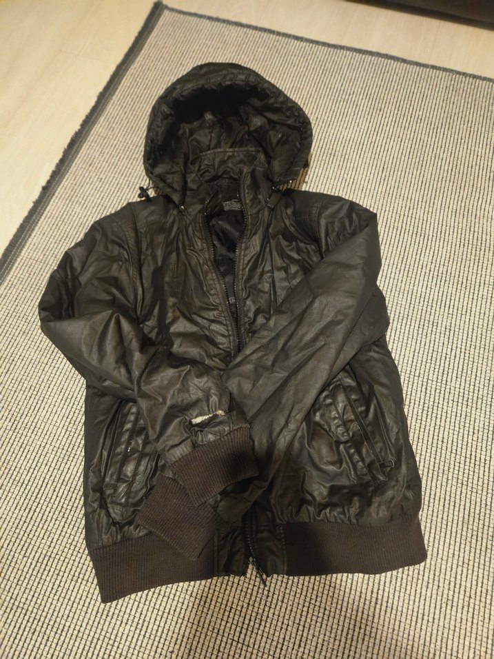Erkek Siyah,bir kolu motora takıldı kucuk yirtik,onun dışında cok iyi durumda, kapüşonlu ve tokalı detaylı, uzun kollu, midi boyda, sokak tarzı uyumlu kadın ceketi. Rahat günlük kullanım için uygundur.