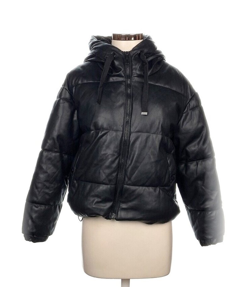 Siyah deri kapüşonlu, fermuarlı kadın ceket. Rahat kesimi ve dolgulu yapısıyla günlük sokak stili için uygun, midi boyda sıcak tutar.