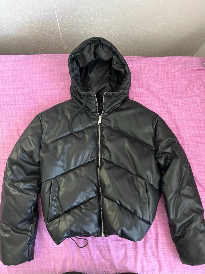 Siyah deri, fermuarlı ve kapüşonlu mont. Beli ayarlanabilir . Midi uzunlukta, dış mekan kullanımı için uygun.