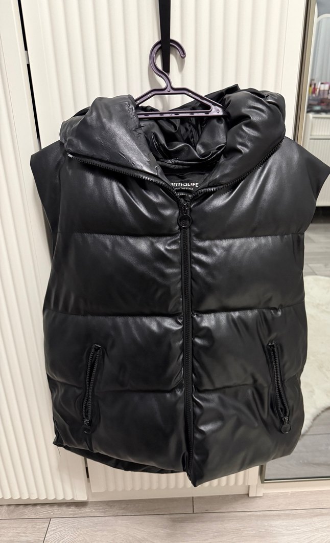 Siyah deri, kapüşonlu ve fermuarlı, kolsuz şişme yelek. Fitted midi boy, rahat sokak stili için uygun. Koyu tonlarda ve konforlu bir tasarım.