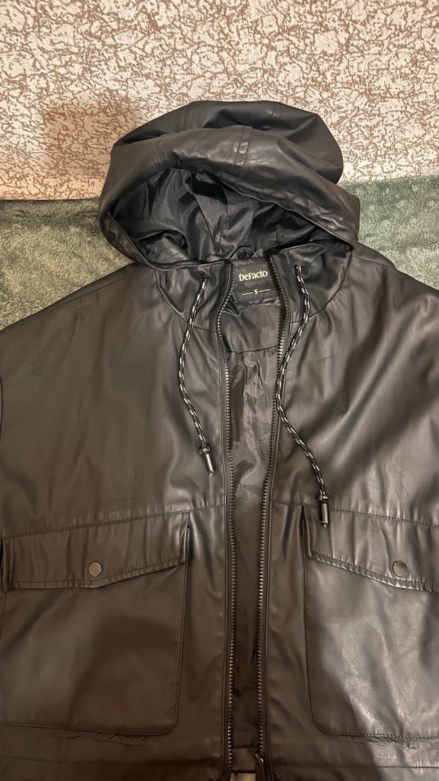 Siyah deri trençkot, fermuarlı ön ve kesik yakalı. Uzun kollu, bol kesim ve kapüşonlu, günlük sokak stili için uygun. ️iç kısımında az soyulma vardır