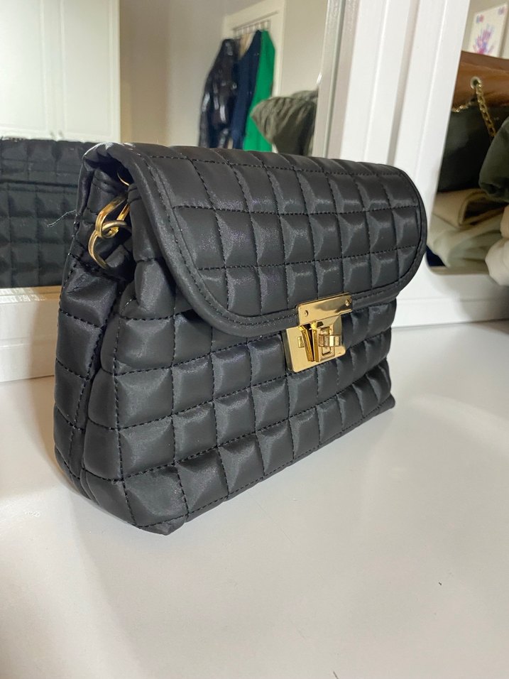 Siyah deri kareli desene sahip, altın renk tokalı bu kadın çantası günlük kullanıma uygun klasik Paris tarzında tasarlanmıştır.
