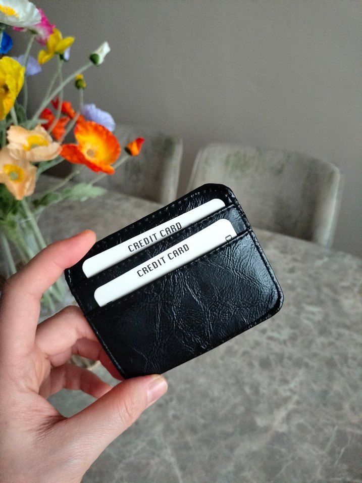 Siyah deri kartlık. Günlük kullanım için uygun, sade ve temel Paris tarzı kontrkültür stilinde.