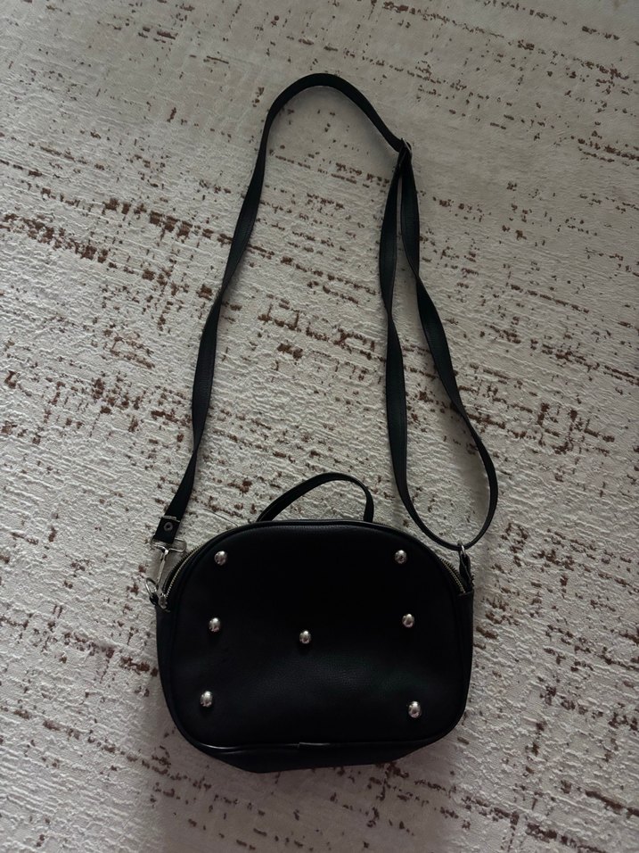 Siyah deri, tokalı ve gümüş çivili kadın çantası. Ayarlanabilir omuz askısı ve parlak, kompakt tasarıma sahip. Rock punk tarzına uygun. #siyahçanta #zımbalı #vintage #bohem #baguettebag #crossbody #çantaaşkı #indirimliürünler #sıfırayarında #markasız #trendçanta #okulçantası #geceçantası #minimalist #aksesuarsever