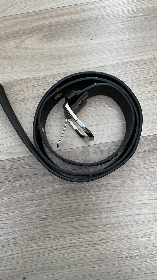 Siyah deri kemer, minimalist ve biker tarzına uygun basit tokalı kemer tasarımına sahiptir.