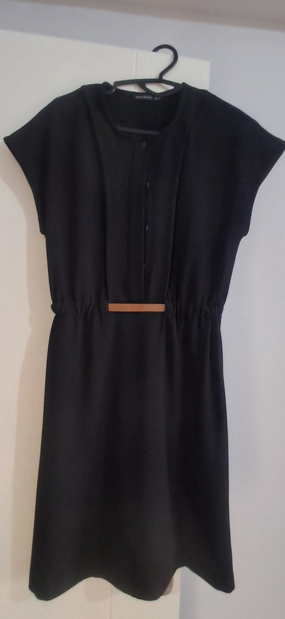 Siyah midi elbise, yuvarlak yakalı, kemerli ve regular fit kesime sahip. İnce askılı kollarıyla günlük sokak stiline uygun.