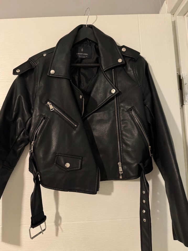 Siyah deri kemerli biker ceket, fitted kesim ve kesik yakalı. Askılı kollu ve kemerli, punk rock tarzı. Günlük kullanım için uygun.