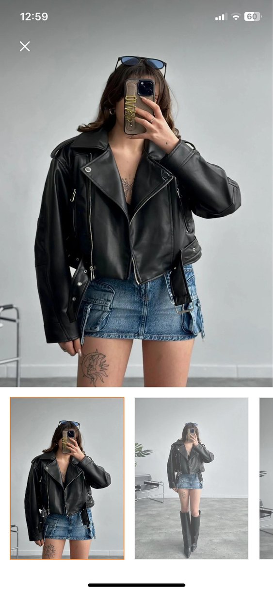 Bu dar kesim siyah deri biker ceket, kemerli bel, askısız yaka ve askılı kollarıyla trendi günlük stil için uygundur. Hiç bir sorunu yok ,