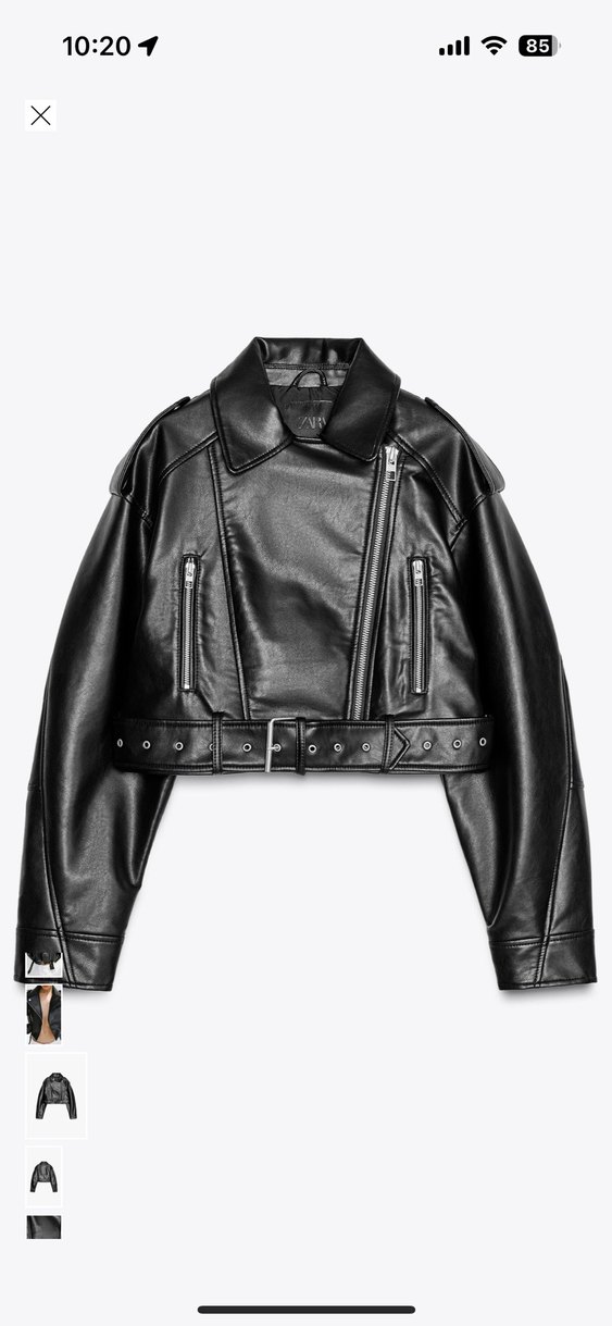 Siyah deri, kemerli biker ceket. Notched lapel yakası ve strappy kollara sahip, günlük kullanıma uygun rock punk tarzında regular fit.