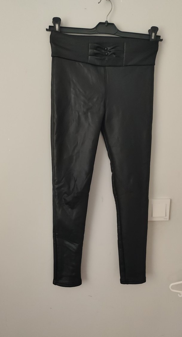 Siyah deri malzemeden yapılmış, kemerli ve midi boy dar kesim kadın tayt. Cesur goth athleisure tarzı için uygundur.