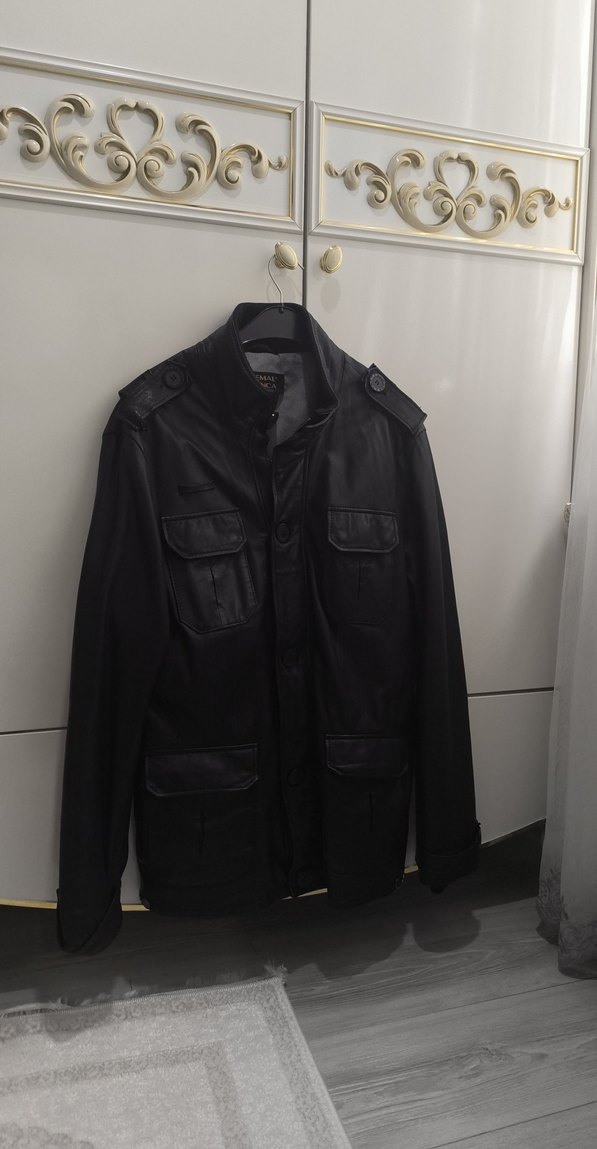Siyah deri kemerli erkek ceketi, kesik yakalı ve uzun kollu. Cep detayları ve normal kesimiyle günlük sokak stili için uygun.