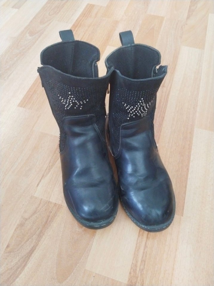 Siyah deri, kemerli, gotik tarzda kadın botları. Koyu renk ve desen içermeyen tasarımıyla rock punk havası verir. 35 numara # ufak bir fermuar sıkıntısı var.tamir olursa taş gibi