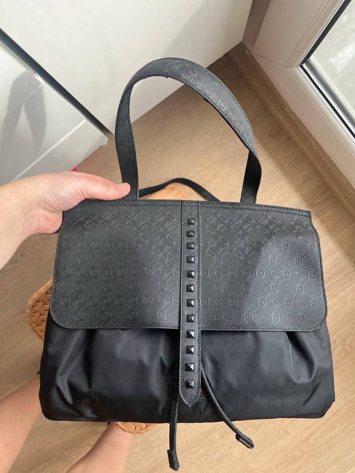 Orjinaldir Siyah deri, kemerli kayışlı, gotik tarzda günlük kullanıma uygun kadın çantası. Hafif kabartmalı desenli ve koyu renklidir.