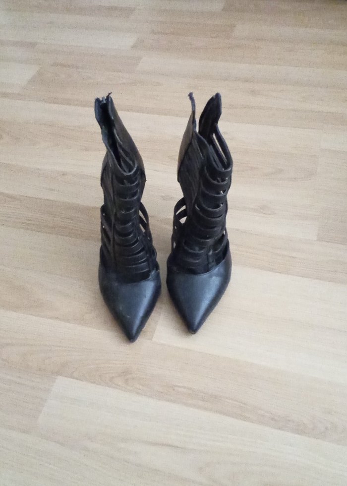 Siyah deri, kemerli ve stiletto topuklu kadın botları. Gotik tarzda, romantik akşamlar için uygun, desensiz ve şık.