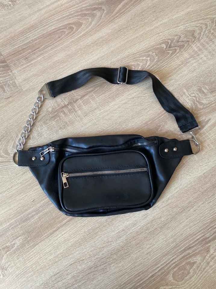Siyah deri bel çantası, kemerli ve fermuarlı ceplere sahip. Minimalist, desen içermeyen tarzıyla günlük kullanıma uygun.