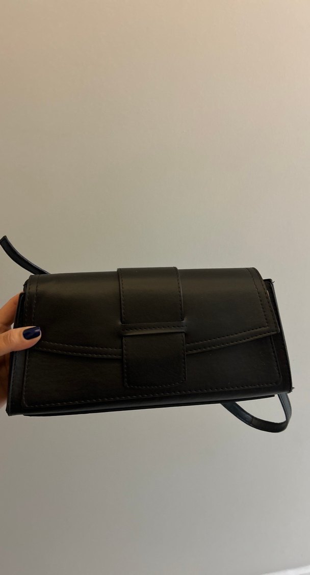 Siyah deri kemerli kadın çantası, minimalist tarzı ve sade deseniyle günlük kullanıma uygundur. Sokak stili ve temel kıyafetlerle uyumludur. Yan tarafında küçük bir kusuru var.