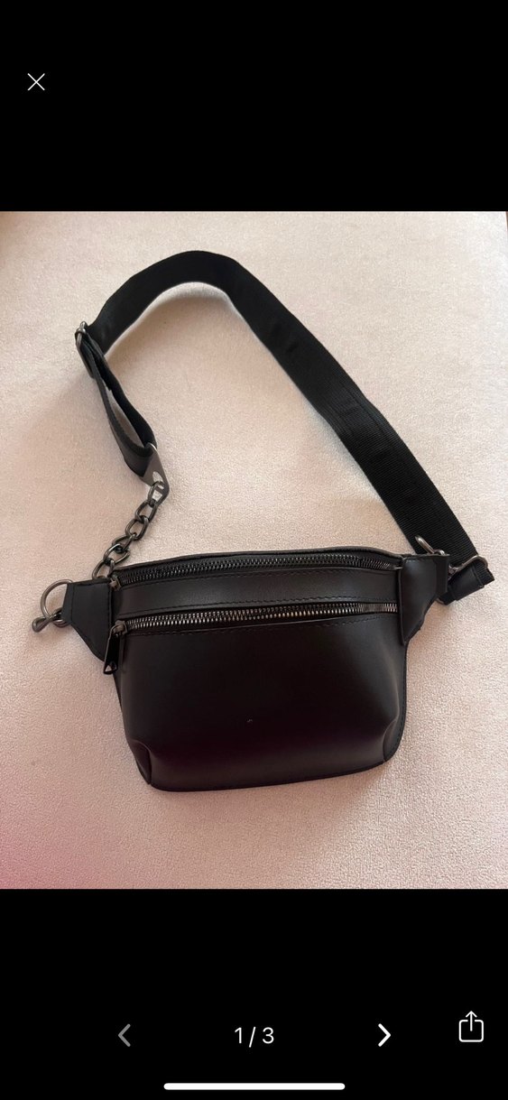 Siyah deri kemerli çapraz çanta, fermuarlı kapaklarıyla minimalist sokak stili için uygun. Günlük kullanıma pratik, desensiz tasarım.