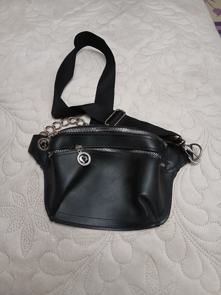 Siyah deri, kemerli ve fermuarlı detaylı çapraz çanta, günlük kullanım için minimalist goth tarzında tasarlanmıştır.