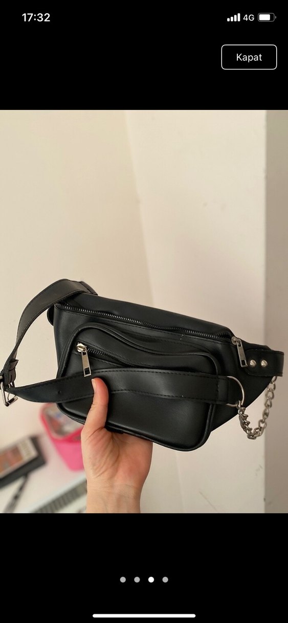 Kemer detaylı siyah deri çapraz çanta, çoklu fermuarlı bölmelere sahip. Günlük kullanıma uygun, minimalist ve trend casual tarzda.