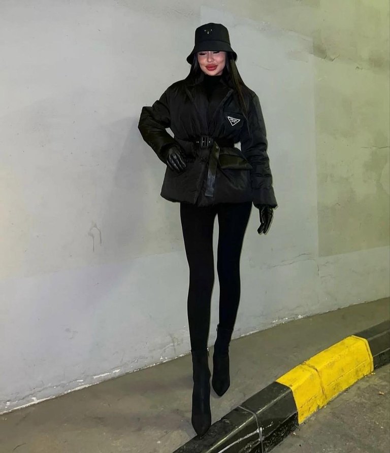 Bu siyah deri kemerli kışlık ceket, yüksek yakalı ve uzun kolludur. Normal midi boyda olup sokak stili için uygundur.