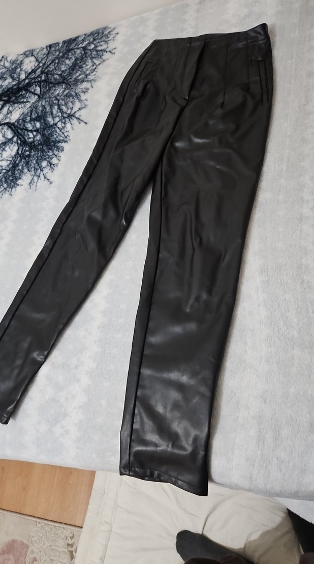 Siyah deri, kemerli, midi boy, dar kesim kadın pantolonu, minimalist sokak stili için uygundur.