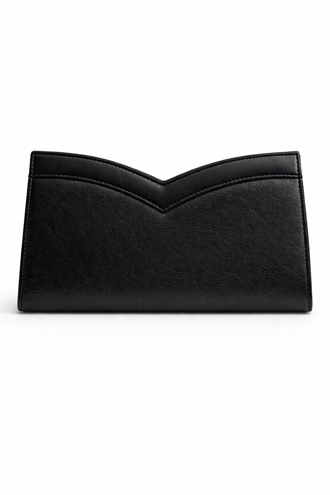 Siyah deri kemerli kadın portföy çanta, modern klasik ve minimalist tasarıma sahiptir. İçine telefon ve küçük cüzdan sığar, küçük bir el çantası. Gece kullanımı için uygun.