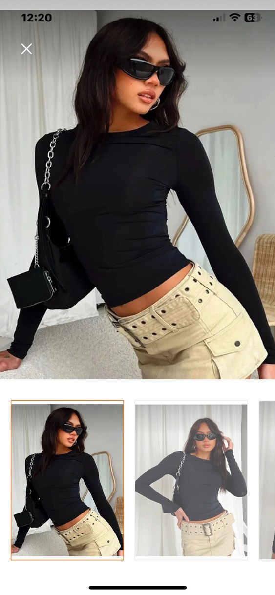 Dar kesim siyah deri bluz, uzun kollu, yuvarlak yaka ve kısa kesim kemerli detaylara sahip, günlük sokak stili için uygundur. Hiç kullanmadım