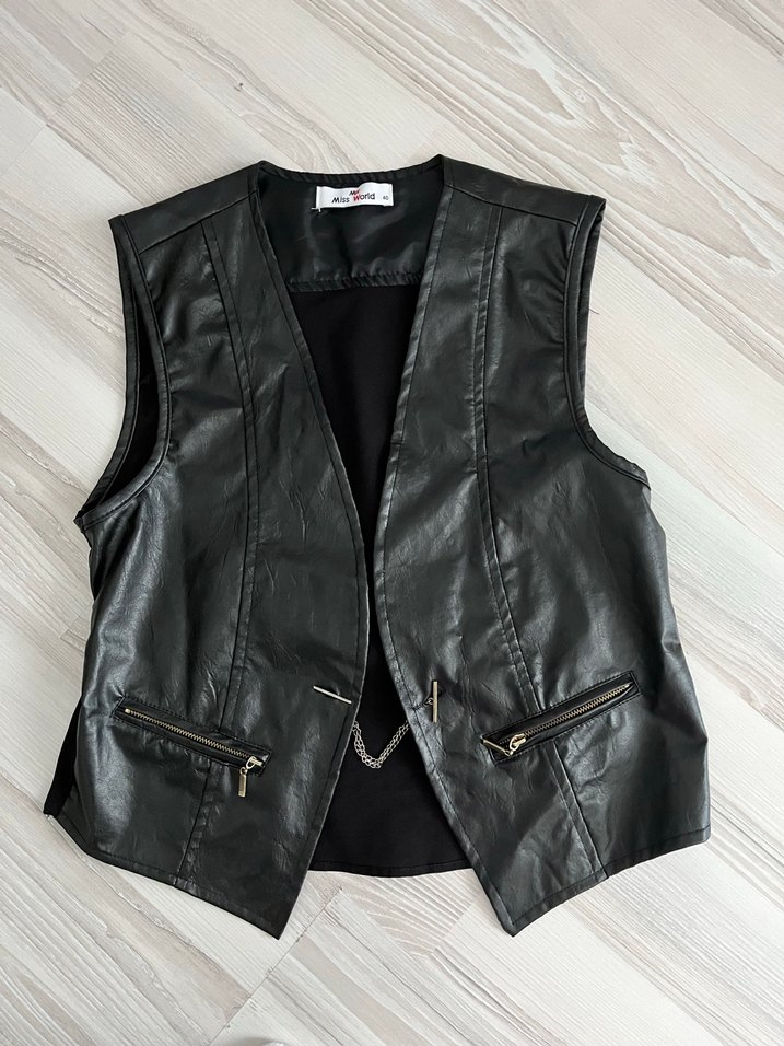 Siyah deri, kolsuz biker yelek, V yakalı ve kemerli. Fermuarlı cepleri ve normal midi boyu ile trend günlük tarz için uygundur.