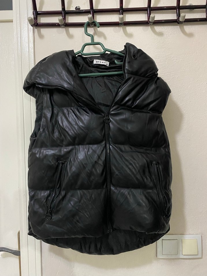 Kolsuz siyah deri yelek, yüksek yakalı ve kemerli detaylara sahip. Günlük kullanıma uygun, midi boy ve dar kesimdir.