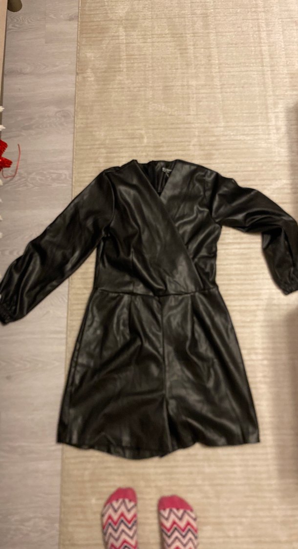 Siyah deri, uzun kollu, V yakalı ve kemerli bel detaylı, midi boyda gotik Paris tarzı dar kesim ceket.