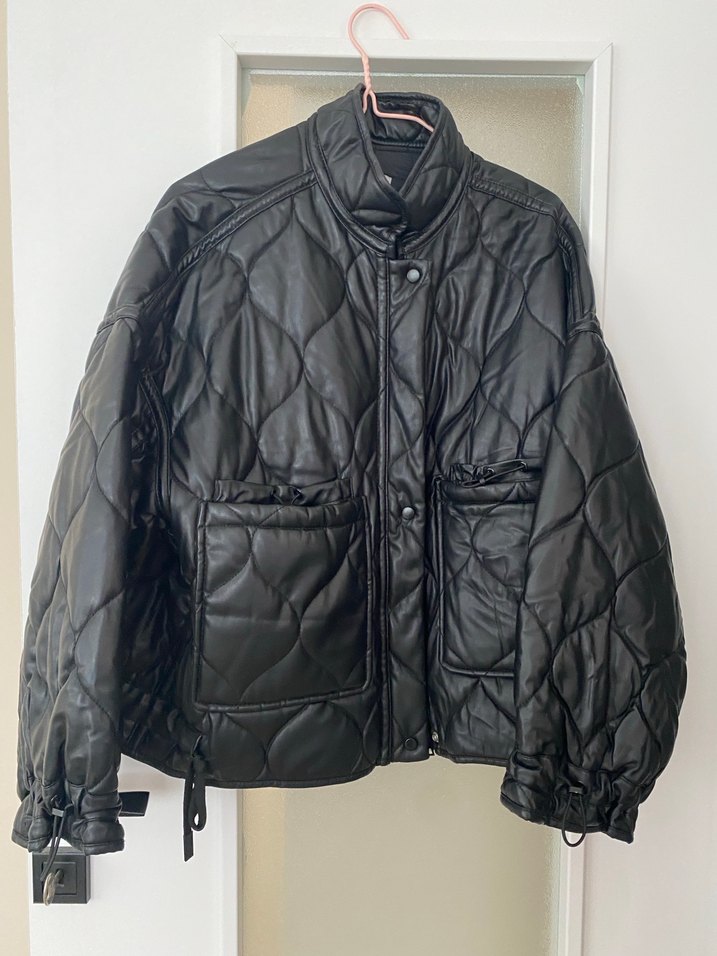 Yüksek yakalı, bol kesim siyah deri ceket. Kemer detaylı ve askılı kollu, sokak modasına uygun.