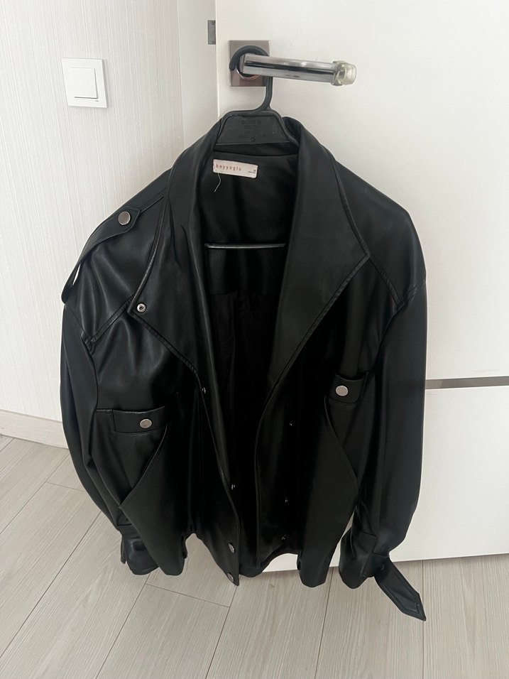 Siyah deri ceket, kemerli ve notlu yaka detaylıdır. Salaş kesimi, askılı kolları ve midi uzunluğu ile günlük şıklık sunar. Fotograflarda gösterdim bi yerin çıtçıtı cıktı sadece bn o şekıl kullandım onun dışında sıkıntısı yok beyyoğlu butik den aldım