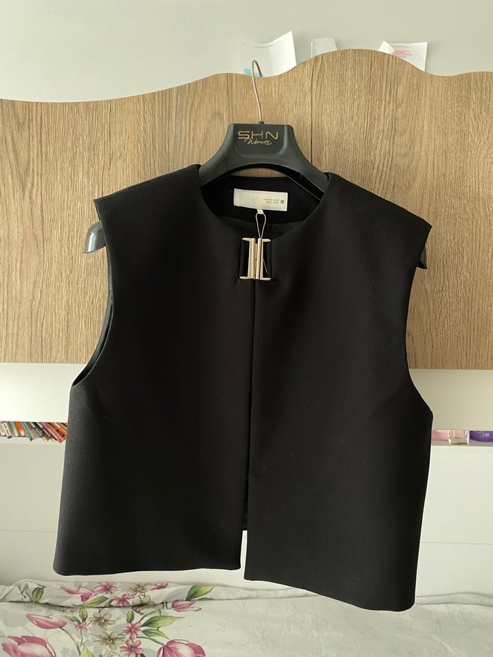 Siyah deri, kemerli, yüksek yakalı ve kolsuz midi yelek. Normal kesim ve desen içermeyen tasarımı ile günlük kullanıma uygundur.
