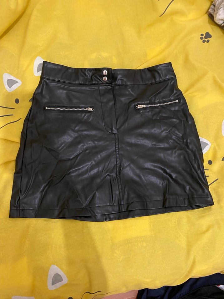 Kemerli ve fermuarlı cepli, siyah deri mini etek, cesur sokak stili için uygundur.