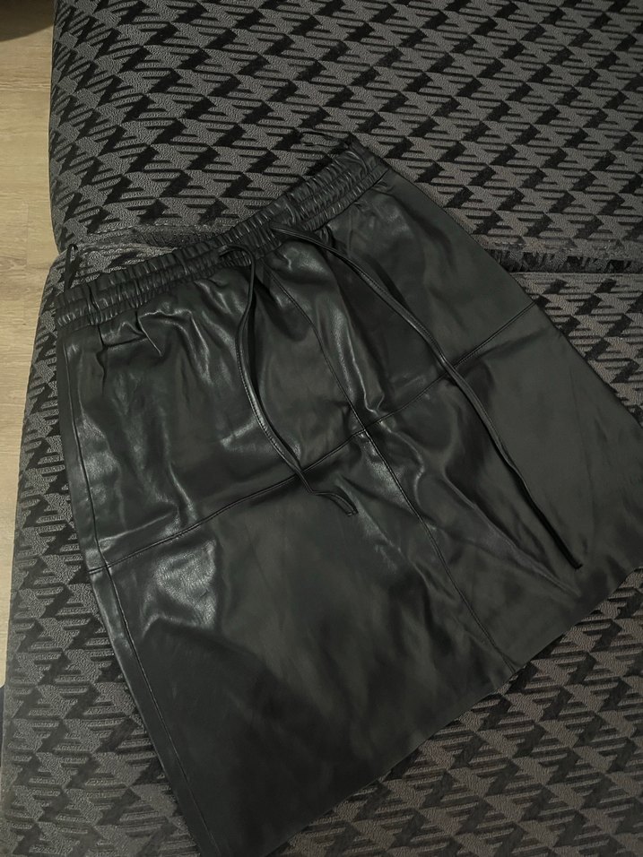 Siyah deri, kemerli ve dar kesim mini etek, sokak stili için uygun kısa boyda ve dış mekan kullanımı için idealdir.