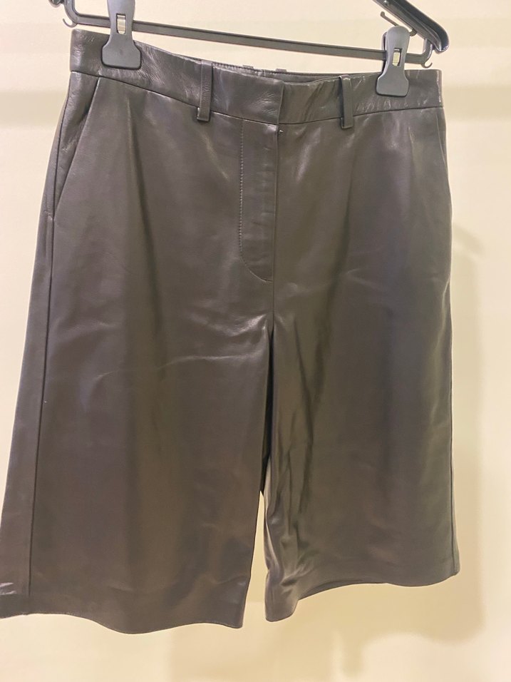 Siyah deri, kemerli, mini boy, regular fit şort. Ofis ve sokak stiline uygun, desensiz şık tasarım sunar. Bel ölçüsü 76-78