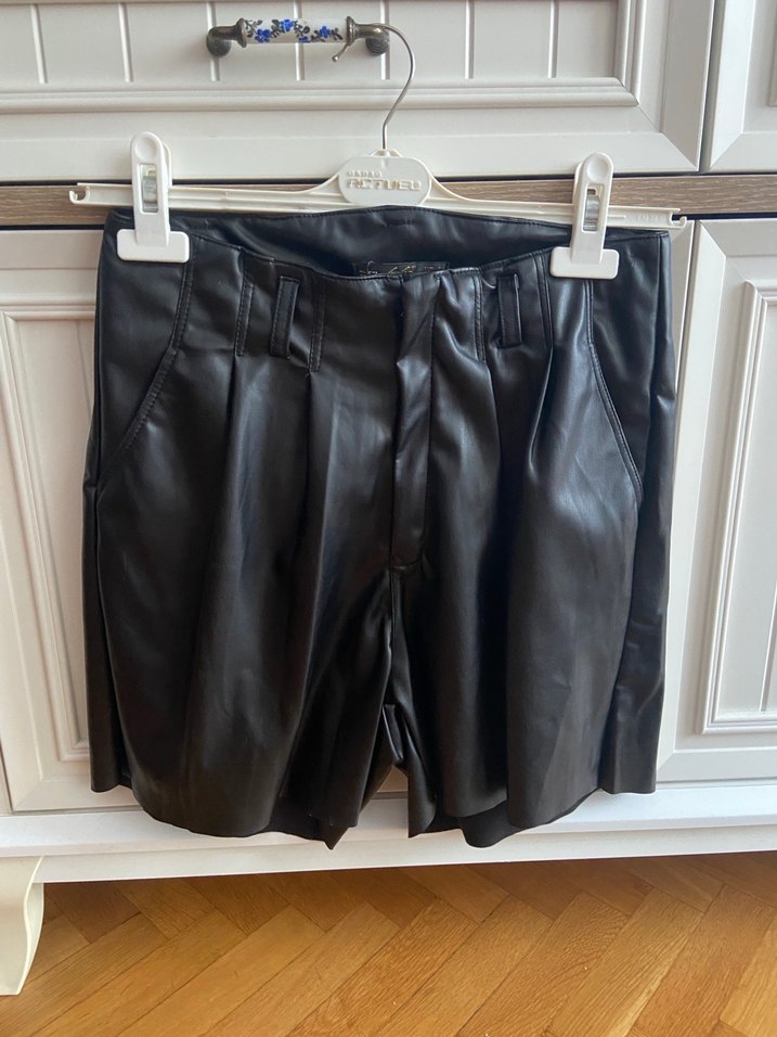 Siyah deri, kemerli ve bol kesim mini şort. Düz yüzeyli, günlük kullanım için uygun ve gotik Paris tarzı etkisi taşıyor.