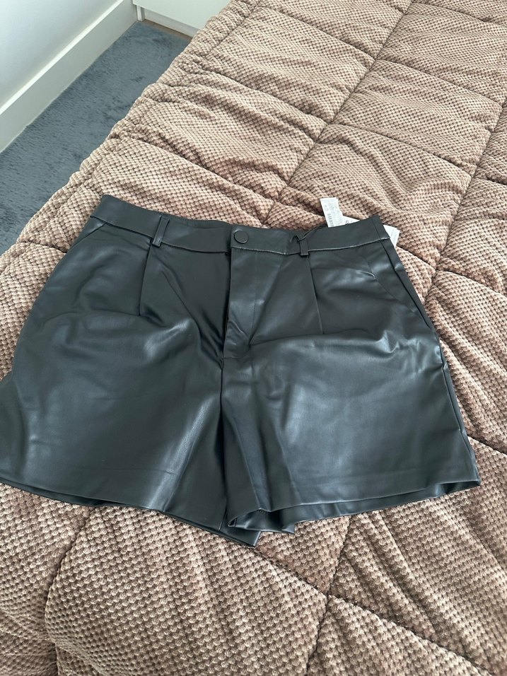 Siyah deri, kemerli ve bol kesim mini şort. Düz yüzeye sahip, günlük rahat kullanıma uygun.