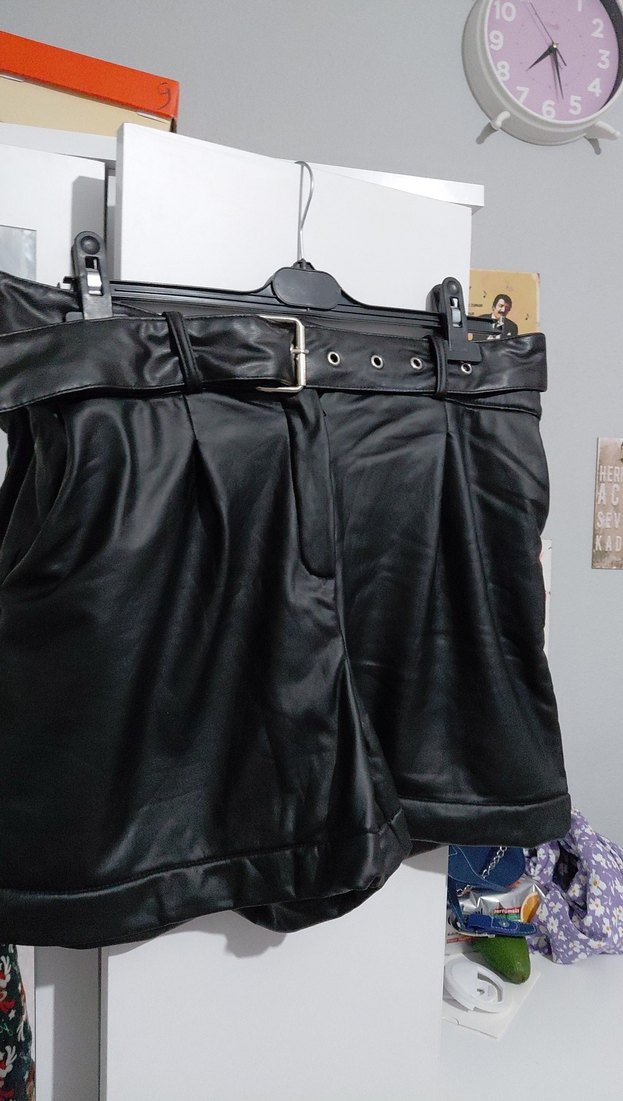 Siyah deri kemerli mini şort, bol kesim ve sokak stiline uygun cesur tasarıma sahiptir. Kısa boy ve desensiz yapısıyla günlük kullanıma uygundur.